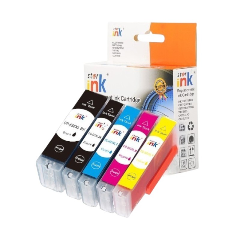 Starink sada náplní PGI-550XL BK / CLI-551XL BK/C/M/Y produkuje kvalitnú tlač porovnateľnú s OEM náprotivkami. Prijatím Starink výrobkov môžete využívať vysoko kvalitné tlačové výstupy za zlomok ceny.Ekosystém našich kompatibilných kaziet navyše prispieva k udržateľnému modelu tlače, ktorý je v súlade so súčasným ekologickým vedomím a rozpočtovými aspektmi.
